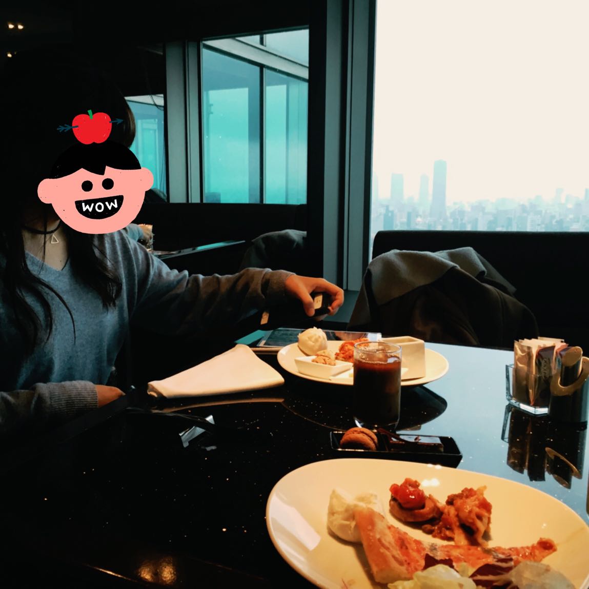 仕事がひと段落ついたので、スイスホテル最上階のスイーツバイキングでお疲れさまパーティをした。せっかく大阪の街を一望できる席なのにめっちゃ天気悪くて残念。