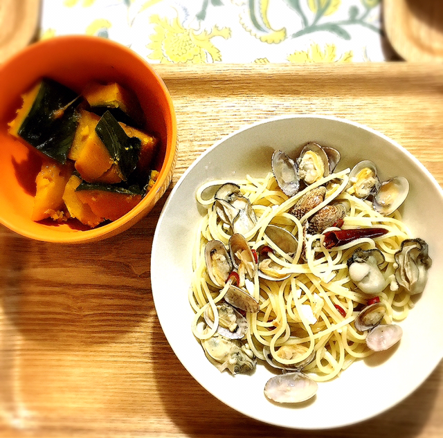 アサリと牡蠣のオイルパスタとかぼちゃの煮付け